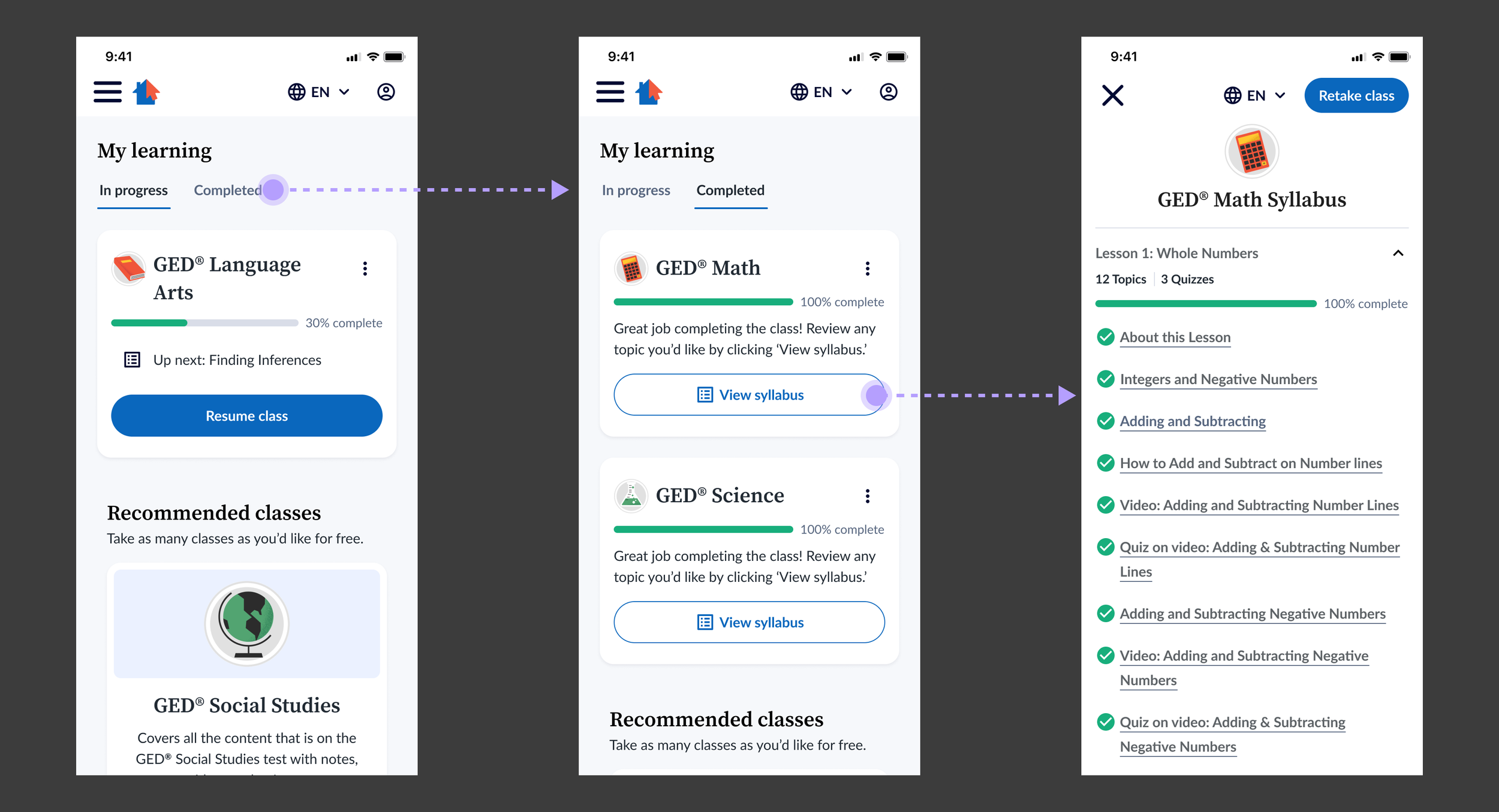 I also introduced a syllabus-based navigation system that makes it easy to jump between sections or re-enter where a learner left off. The “My Learning” dashboard serves as the logged-in home, allowing learners to track progress, resume active courses, discover new offerings, and review completed classes.