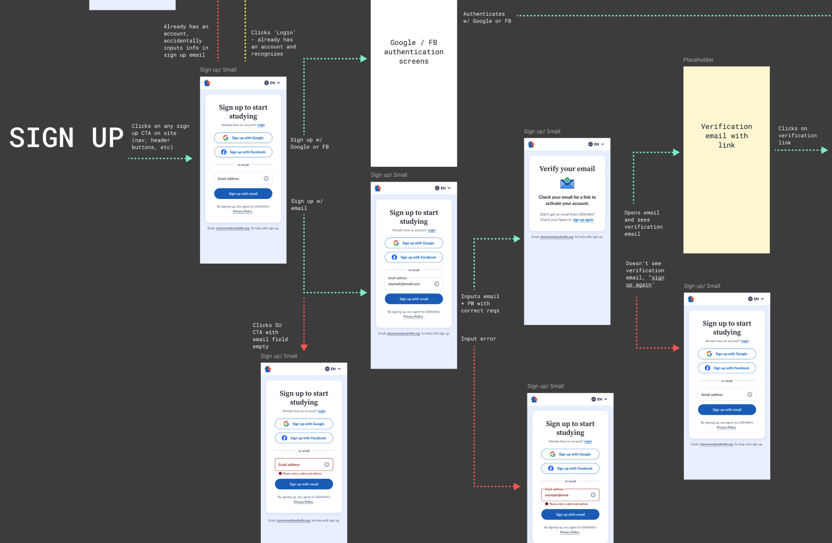 I kept the sign-up flow as streamlined as possible and significantly reduced the amount of personal information required to create an account. USAHello’s research shows that many learners—particularly those with insecure legal status—were hesitant to share identifiable data, such as full names, online.