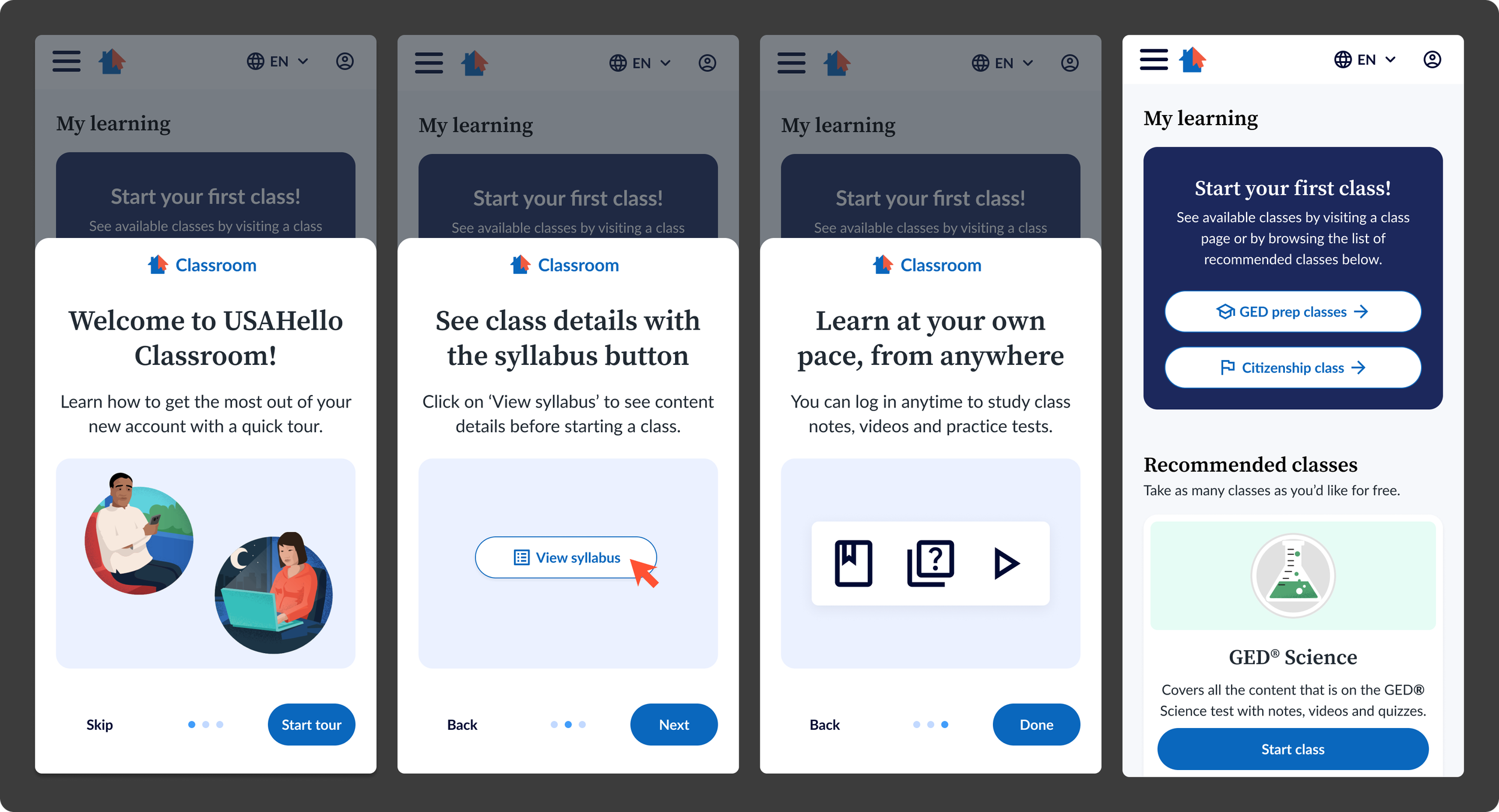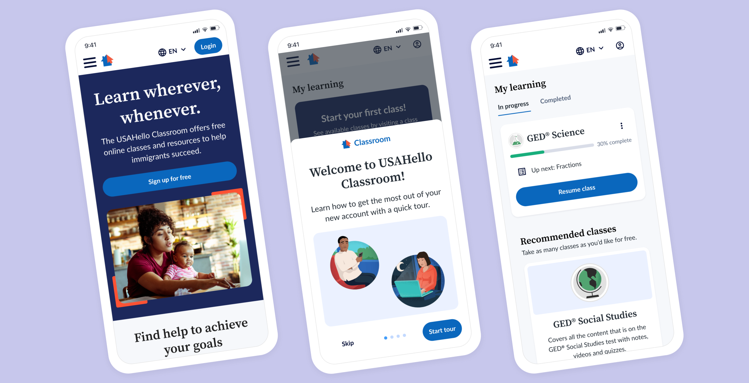 USAHello is a nonprofit platform that connects more than 3.5 million immigrants each year to multilingual information and resources across their ecosystem of products. USAHello Classroom is their educational platform offering free self-paced classes. At the time of the redesign, the Classroom primarily offered GED exam preparation, with a U.S. citizenship exam prep class in the works.