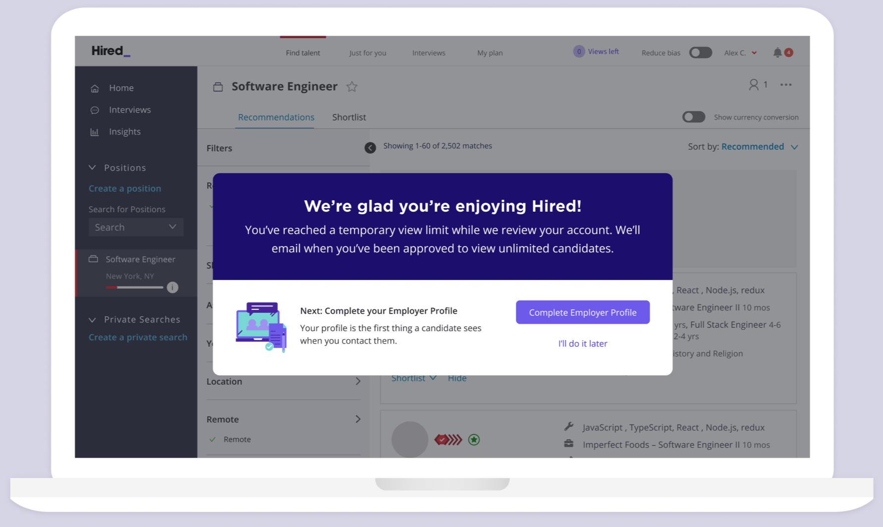 Once the limit was reached, a modal explained the review status and guided users toward productive next steps, such as completing their employer profile or contacting support, framing the restriction as progress rather than blockage.